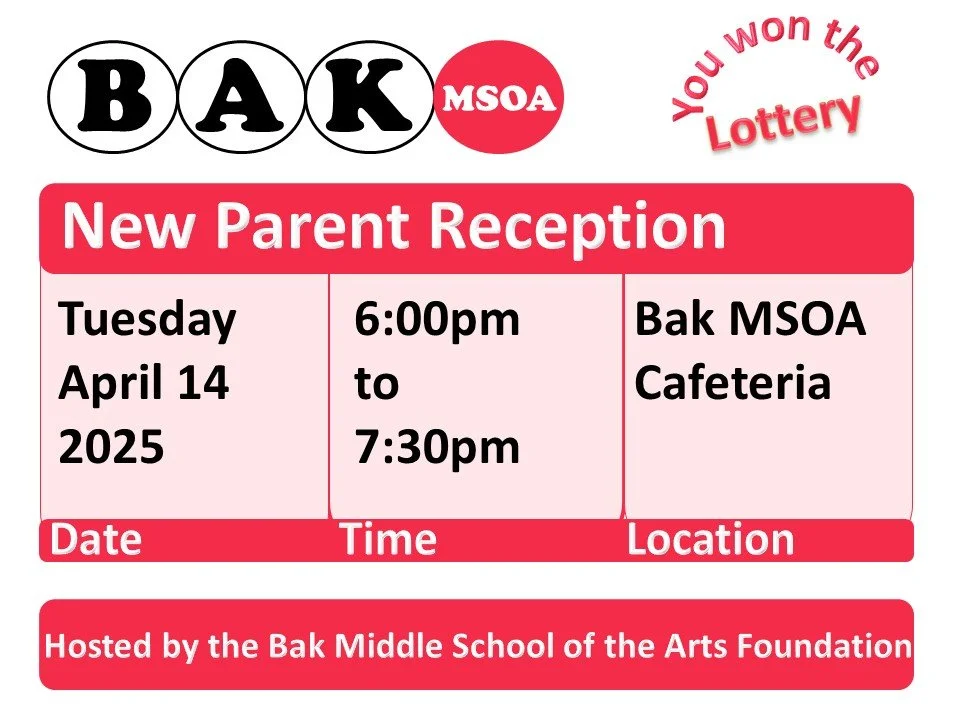 Congratulations! On behalf of the Middle School of the Arts Foundation, WELCOME TO BAK! This is an exciting time for your family, and we wish you the very best as you begin this new middle school journey.